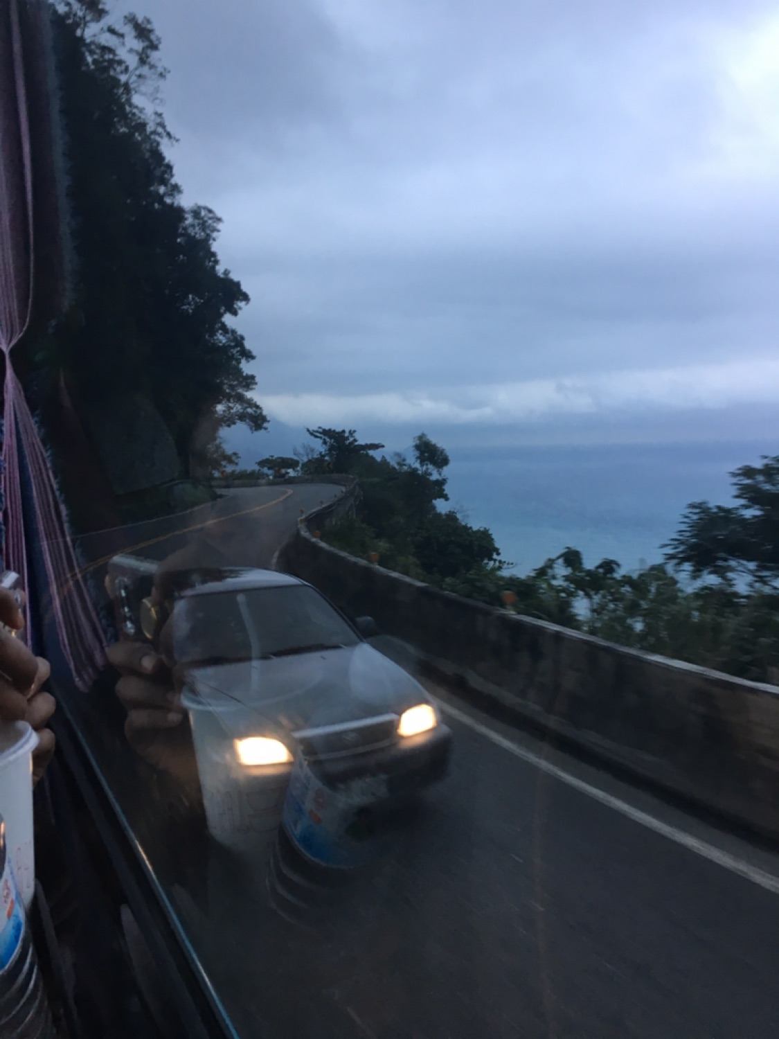 In regards to the infrastructure of Taiwan, I was so amazed at the roads that we traveled on to get to Hualien from Yilan this weekend. Since both of these towns are in the eastern part of Taiwan, there is a lot of mountains that you have to travel around and through to get to them. The eastern part of Taiwan obviously runs right along the ocean so the views simply from my bus seat were incredible. The main reason why I was so amazed at the roads was because of how narrow yet widely traveled they were. We were a relatively large bus so the driver drove slow since the road was constantly curving to hug the mountain. However, cars would drive super fast past us on the curves, not at all seeming like they were the least bit concerned about a head on collision. Of the all the places I have traveled in the United States, I have never been on a road so narrow and so high up in the mountains. It was quite an experience to just ride on the bus and look at the beautiful view of the ombre blue ocean with varying depths. Beyond this, there were quite a few tunnels that we traveled through but several of them were one lane tunnels. This is quite rare in the United States since more people are going through tunnels underwater and a single lane or even two lane road could lead to a traffic nightmare if there is an accident. Below are some pictures of the view from the bus on these roads.